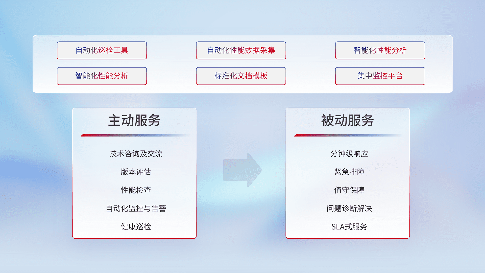 智能化工具和标准化文档,,保障服务质量,,,,提供主动服务(包含技术咨询、、版本评估、、、、性能检查、、自动化监控与告警、、健康巡检)和被动服务包含(分钟级响应、、、、紧急排障、、值守保障、、问题诊断解决、、、、SLA服务)。。