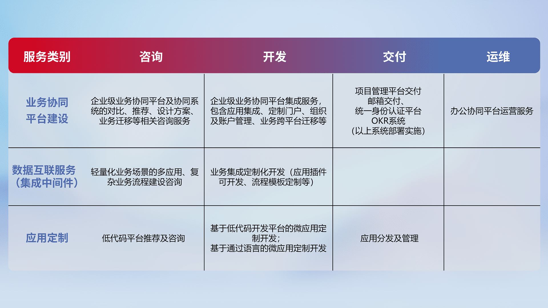 针对钉钉、、、、企微、、、、IDaas等平台级产品提供产品的规划、、、、方案、、、交付、、、定制化开发等服务,,,实现如统一协同办公、、、、智能客户服务、、混合会议管理、、、、智能数据查询、、、、等业务场景,,实现数字化转型。。